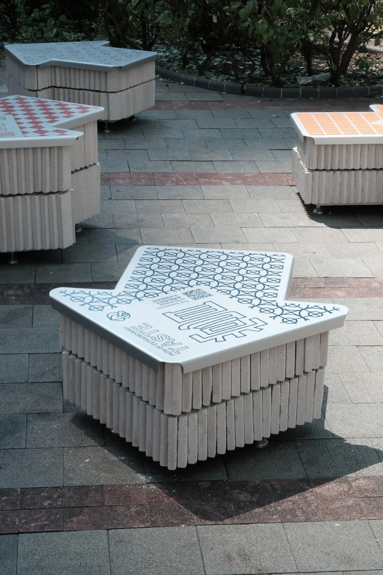 Nestled within a distinctive urban locale, the project sits at the junction of two misaligned urban grids—one tracing the historic Victoria Harbour coastline from the early 1900s, and the other following the skewed streets of Sham Shui Po. The resulting triangular space is both a trace of urban evolution and a testament to infrastructural misalignment. The site’s geometry, emphasized by multi-directional seating, echoes Tai Kok Tsui’s role as a wedge, hinge, and connector between the evolving waterfront and the dense heart of Kowloon near Mong Kok. RE:Find Tai Kok Tsui embraces this spatial complexity while paying homage to the neighborhood’s metalworking heritage through its curved top plate and deliberately misaligned brick edges, reflecting the area’s distinctive cross-grain character.