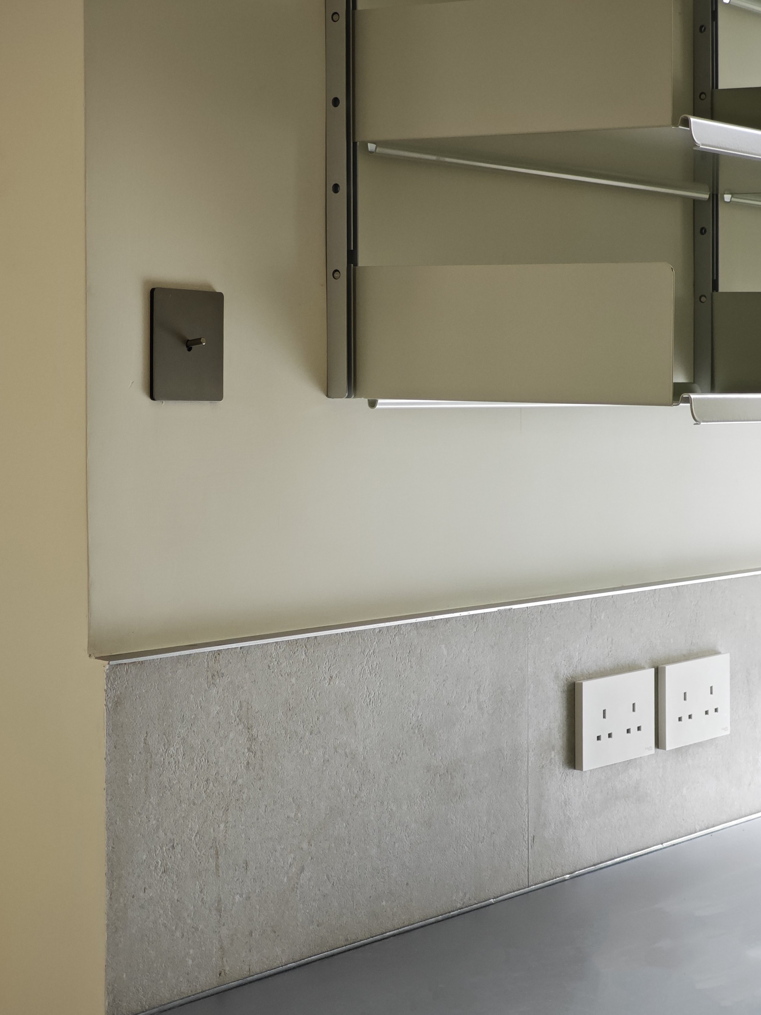 Material articulation anchors the architectural strategy. Oak flooring introduces warmth and tactility, counterbalancing the clinical precision of stainless steel. Green-grey ceramic tiles recall the weathered patinas of Wan Chai’s vernacular facades, tying the interior to its urban memory. Pocket doors—used exclusively throughout—recede into walls, enabling fluid transitions between zones. This choreography of openings and enclosures yields a calibrated, adaptable, and quietly exacting environment.
